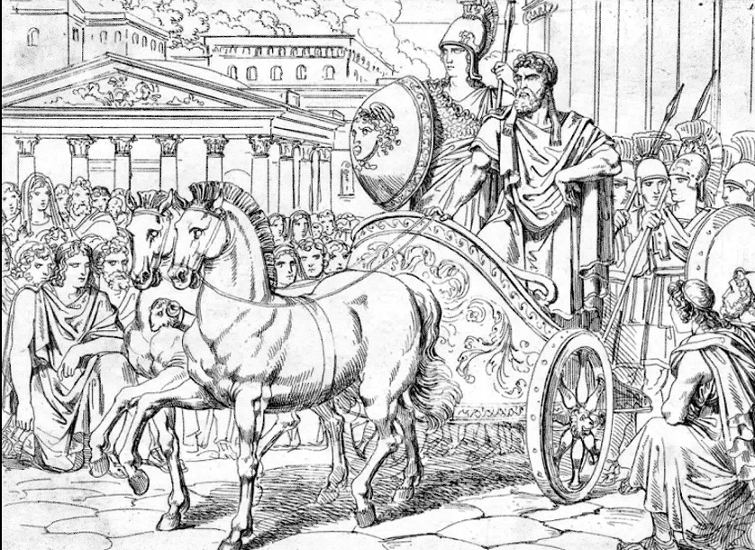 M.A. Barth, Le retour de Pisistrate à Athènes, d’après la description d’Hérodote, illustration de 1838